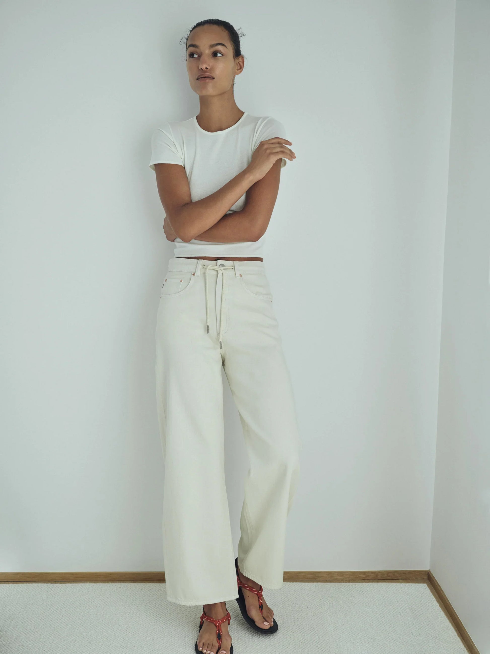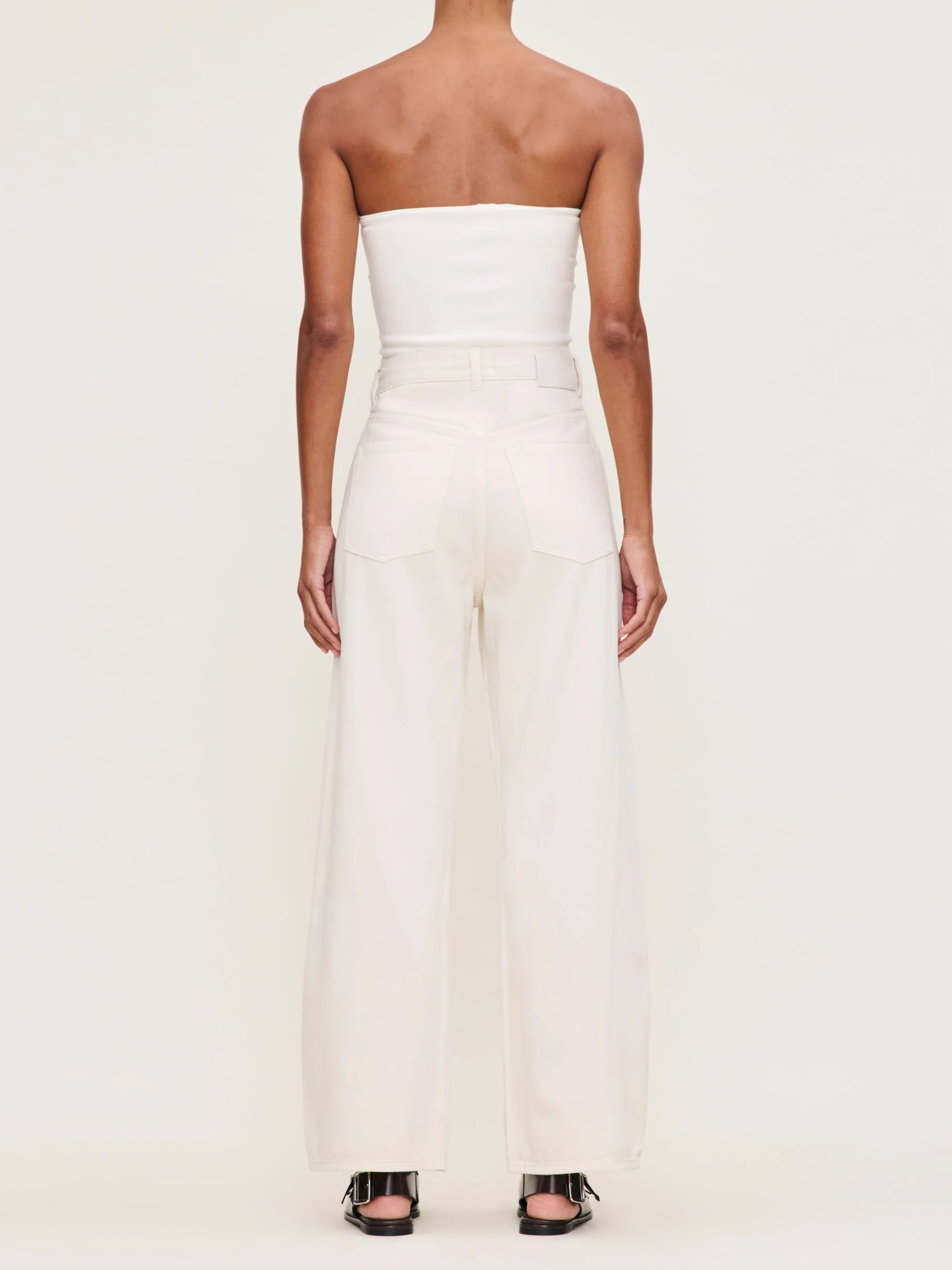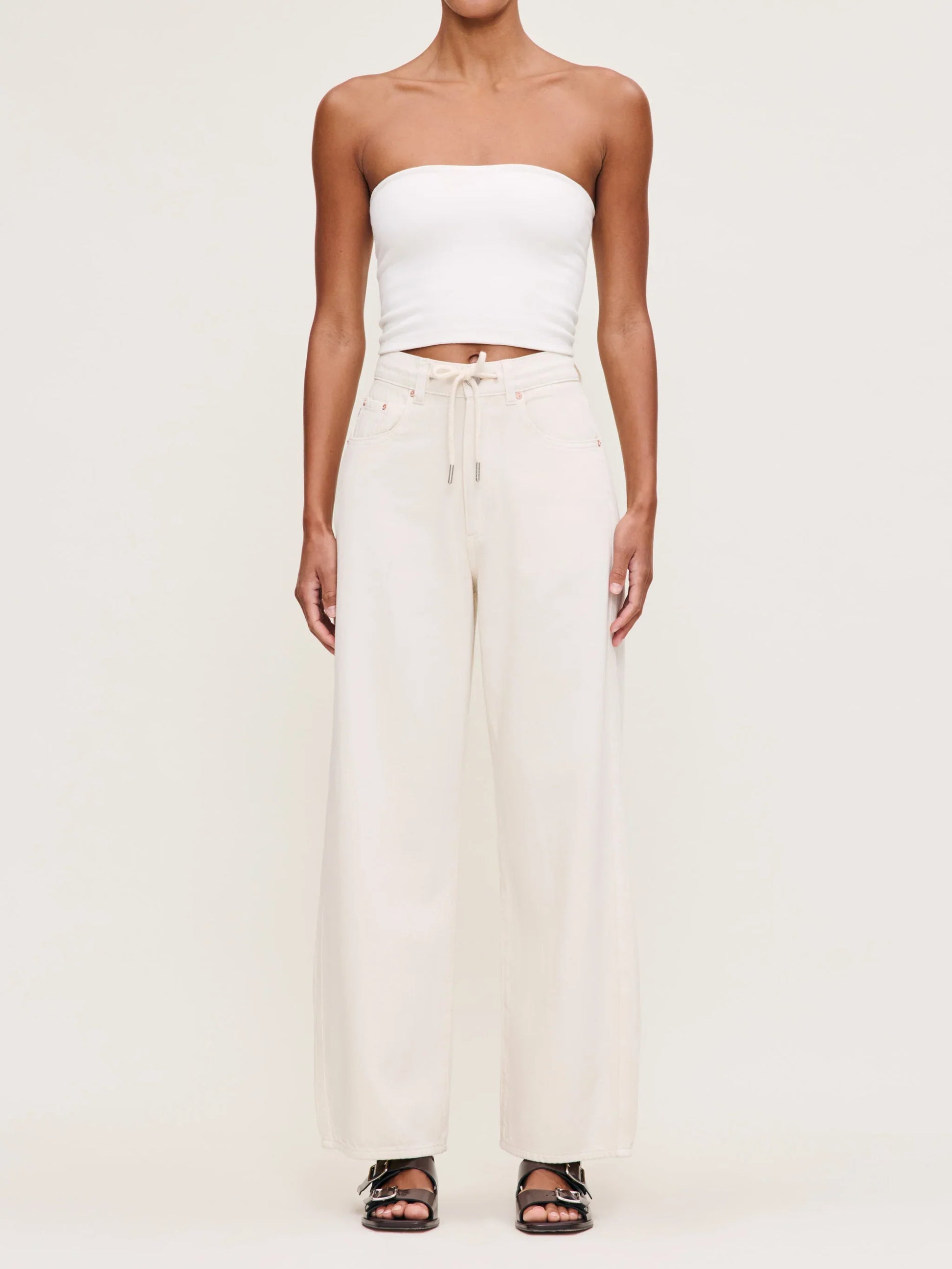 Flax is a warm, off-white denim. It features a drawcord, a silver shank, copper rivets, tonal stitching and a clean hem.